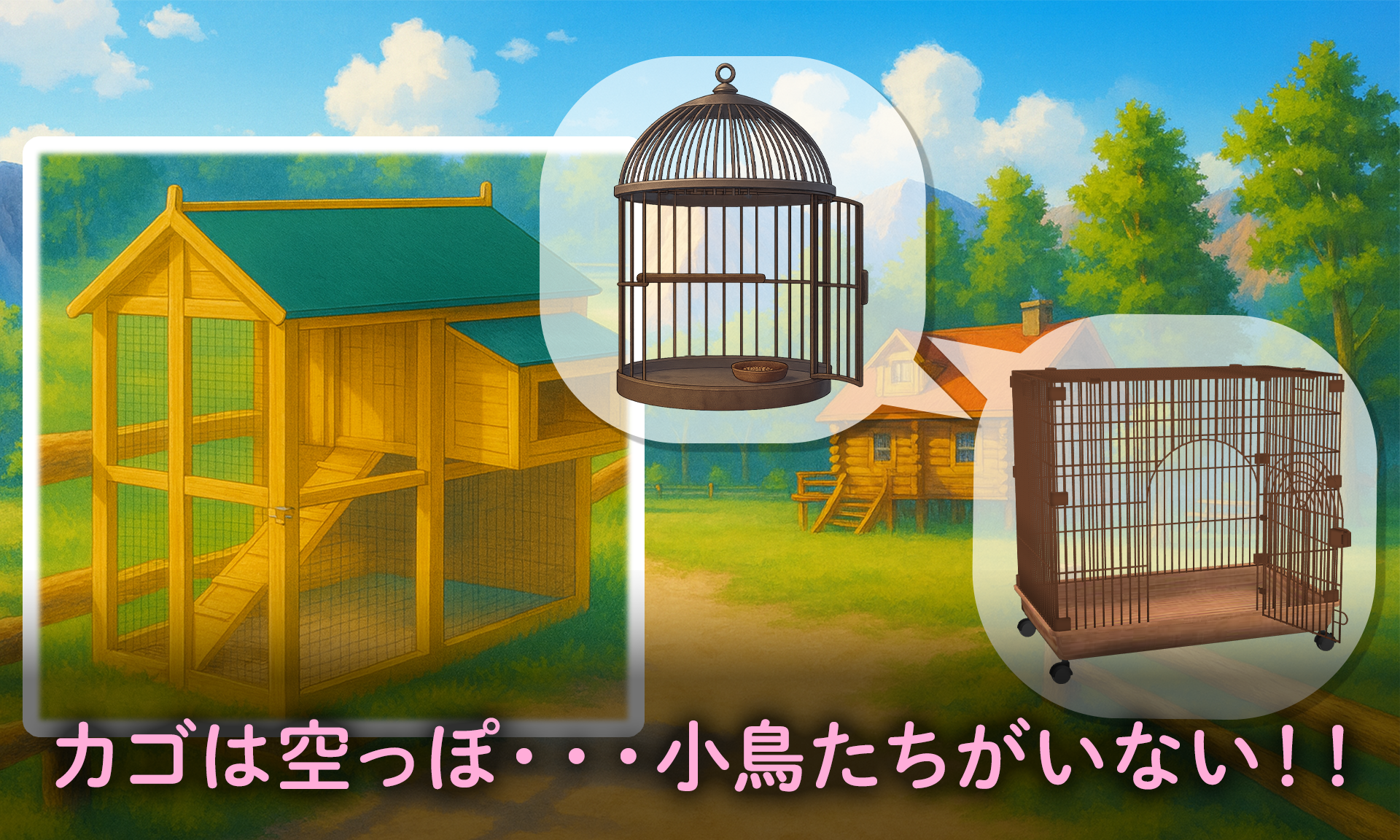 TOP 2025.09.022025.09.04 ひたき日和 小鳥の大脱走 ある日、小鳥がカゴから脱走していた 父が経営する小鳥カフェ「ひたき日和」でお手伝いをしています。ある日、いつも賑わう広場に小鳥たちの姿がなくなっていることに気づきます。父「小鳥を一緒に探してくれ!」父に頼まれたあなたは餌を使って小鳥を誘い出し、広場に戻しながら少しずつ小鳥たちと絆を深めます。そして真相へ近づきます。